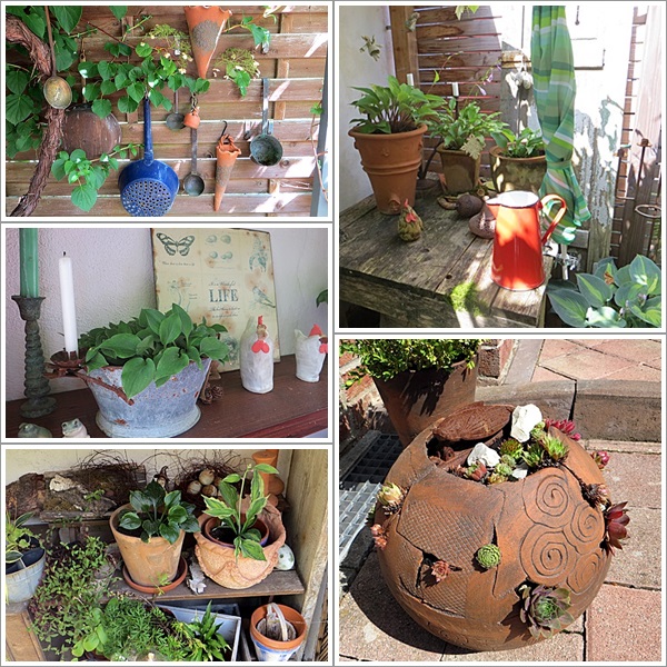 Unter der Veranda befindet sich ein Sammelsurium an Gegenständen, Pflanzen und Dekoartikeln. Mir gefällt sowas ausgesprochen gut und ich wüsste auch schon bei uns einen Platz für so ein Stillleben. Nur hat da mein Mann was dagegen und vor allem stellt sich dann die Frage: Wohin mit den Mülleimern?