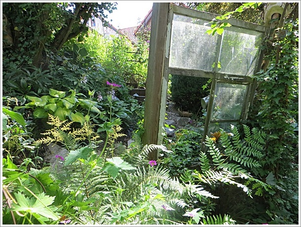 Ein Großteil des Gartens liegt an einem Hang und man muss schon fast eine Gemse sein um ihn gefahrlos erkunden zu können. Zwischendrin stehen alte Fenster, teilweise auch mit zerbrochenem Glas, aber hier passt es einfach dazu